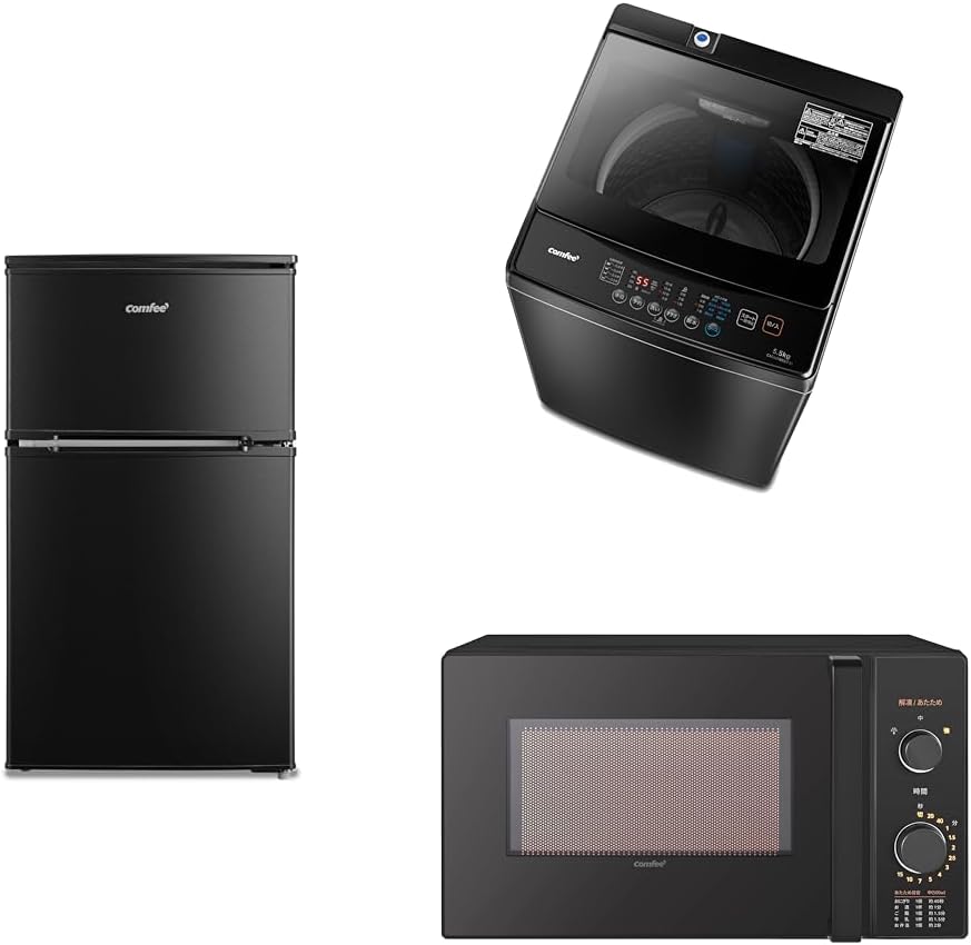 COMFEE 3-Piece Set of New Living Appliances, Refrigerator, 90L Black, Washing Machine, 12.1 lbs 5.5 kg, Microwave 5.1 gal 17 L Black Turntable, Living Alone, Support New Life